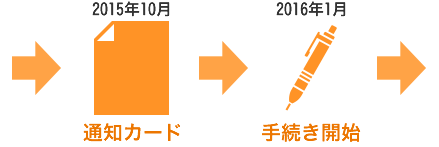 - 2015年10月から市区町村から住民票の住所宛にマイナンバー(個人番号)の通知カードが送られて、2016年1月から社会保障、税、災害対策の行政手続で必要になります。